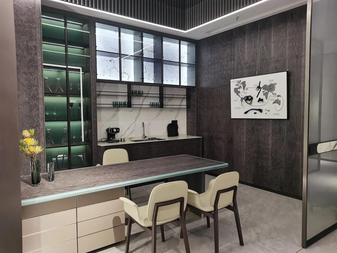 在展厅现场,各系列展厅极具潮流感的空间布局和场景设计,完美呈现了当下流行的空间组合和软装搭配思维;极具时尚品位的产品设计和色彩运用,赋予产品个性鲜明、多元混搭的时尚气质,彰显了圣蒂斯堡“整装定制·全案设计”产品整合优势和特色。